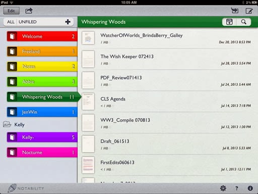 Here are some screenshots. In the first screenshot, you can see that there's a folder system within the app to stay organized. In the second one with the pink highlights, you can see I was trying to choose some passages from my new release, Watcher of Worlds, for excerpts.